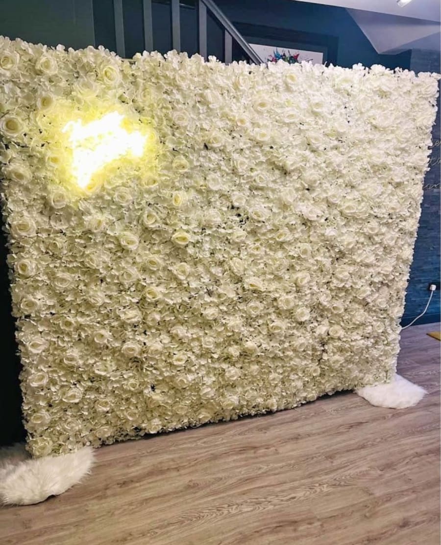 Looking to take your event décor to the next level? Our Ivory Flower Wall can be complemented with additional features to make your celebration truly unforgettable. From a charming balloon display to eye-catching LED light up numbers or letters, we offer a range of options to customize your backdrop and add that extra wow factor to your event.