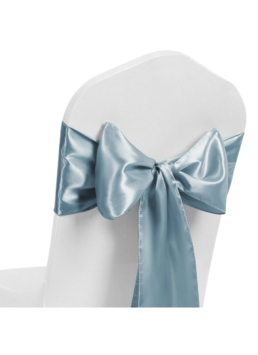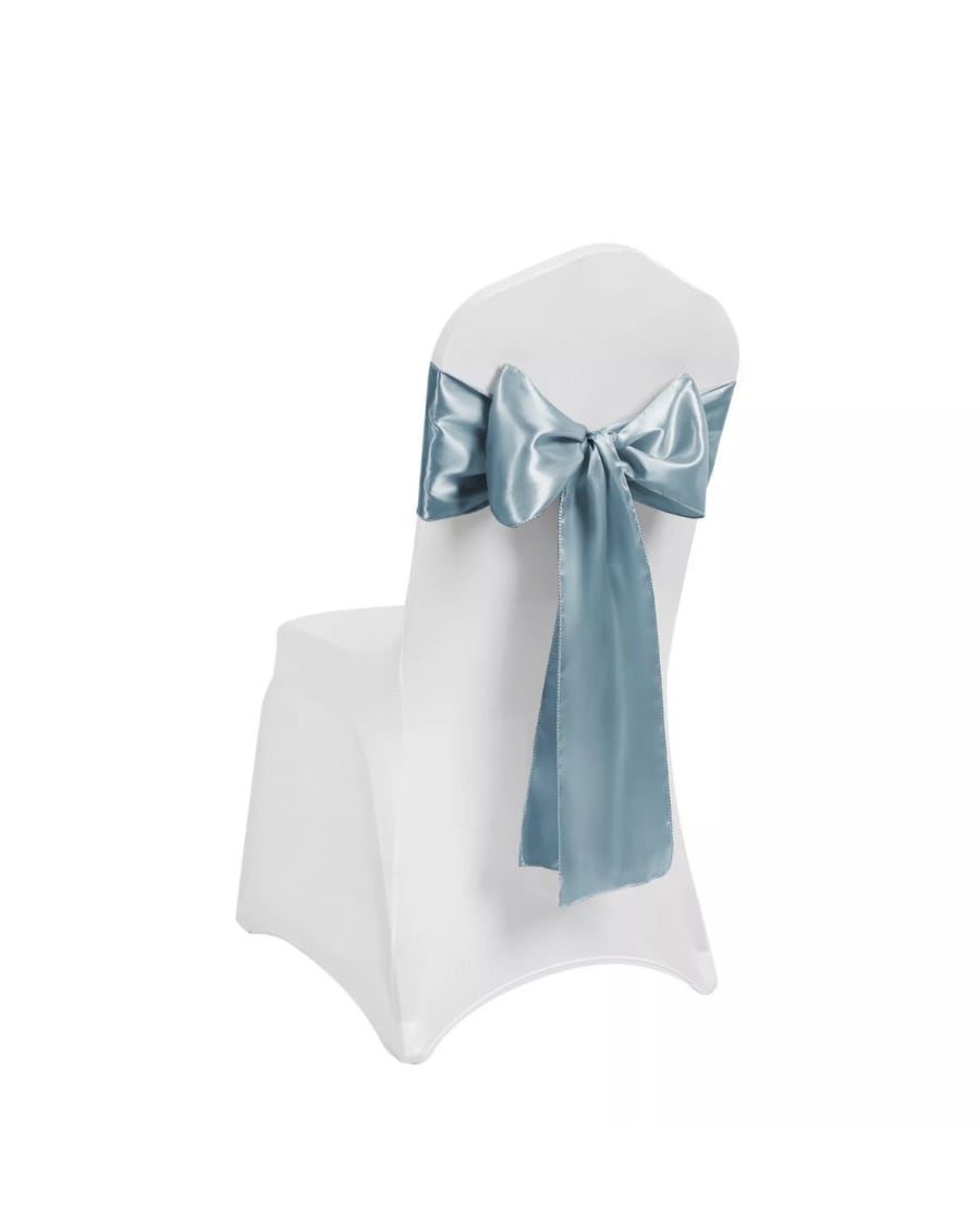 Our main service provides high-quality event rentals that help you create the ambiance you desire. From intimate gatherings to grand celebrations, our Dusty Blue Satin Sashes and Chair Covers add a beautiful and cohesive look to your venue. 🎉